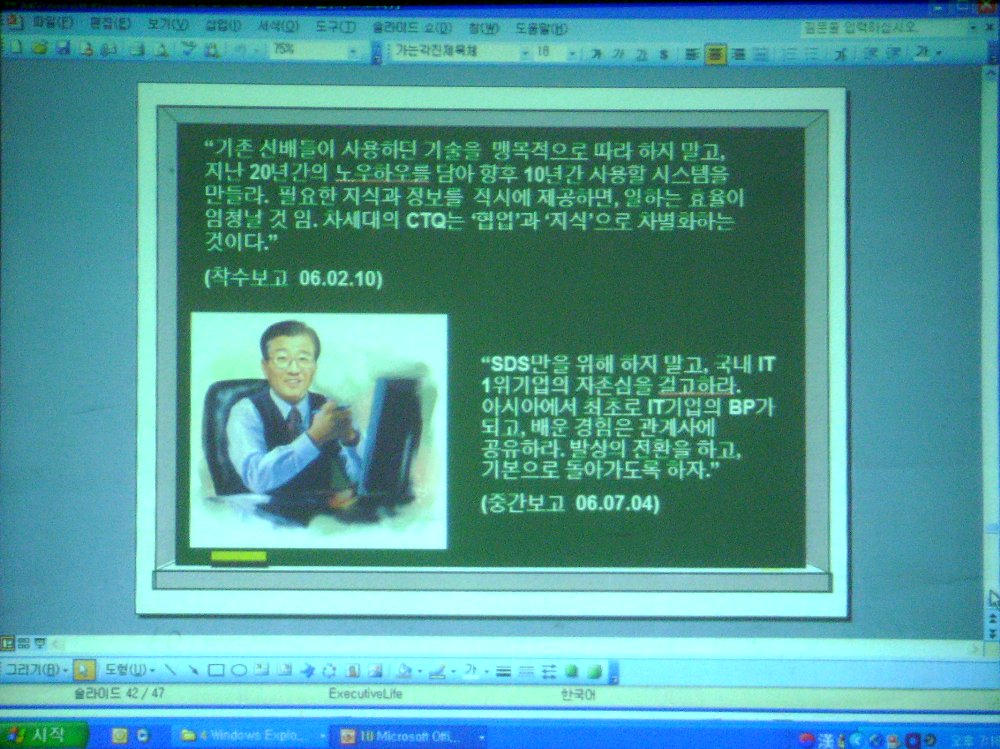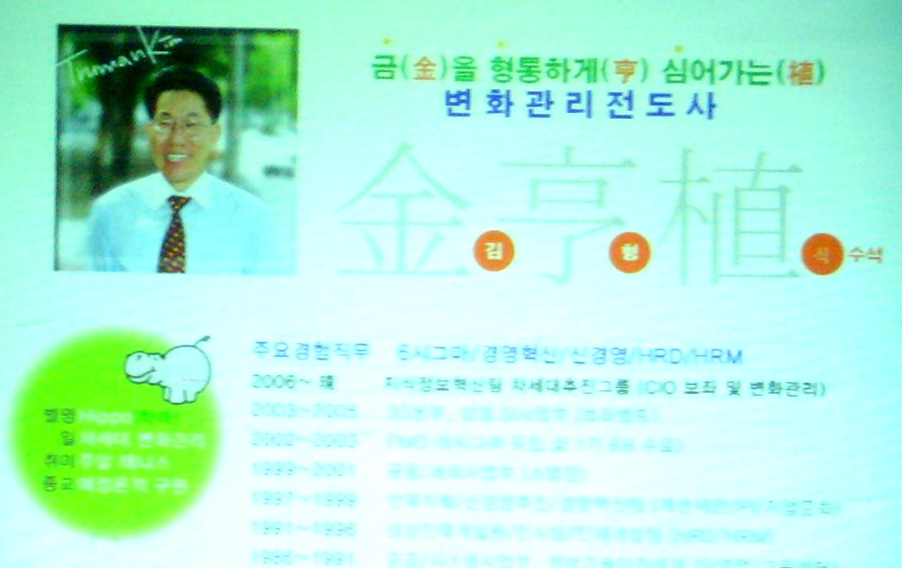 11월22일 저녁 5시30분,조글로CEO클럽에서는 과기대 간호학과2층교실에서 과기대 정광섭교수님의 주선으로 삼성SDS지식정보혁신팀 김형식 수석님의 특강을 들었습니다. 김형식 수석님은 프로젝트 변화관리,프로젝트의 시작과 끝,일하는 방식의 혁신,삼성 신경영,How: 정보시스템 소개 등 방면에 대해서 강의하셨습니다.