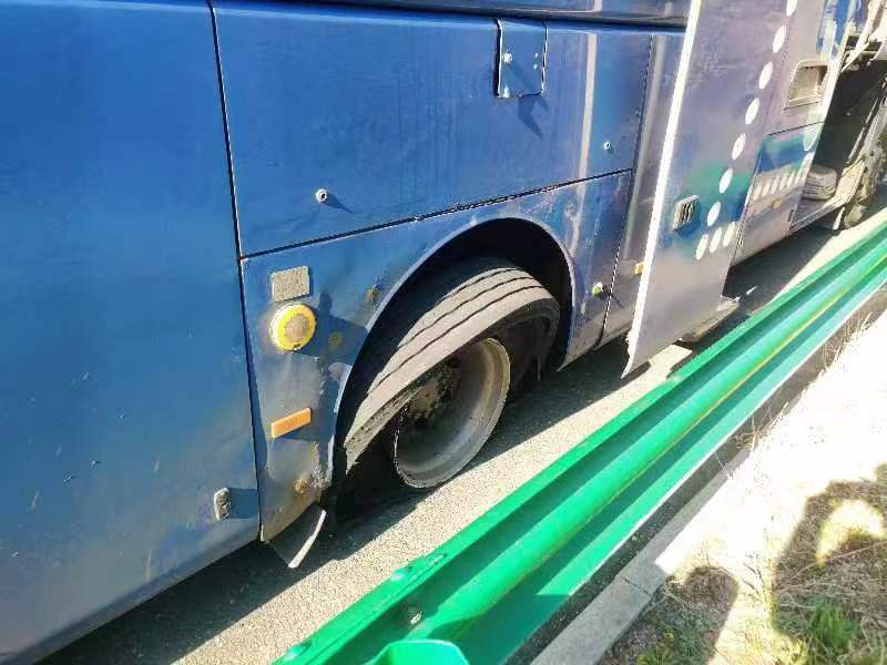 현장에 도착하니 차는 응급차도에 세워져 있고 뻐스의 오른쪽 뒤바퀴에는 폭발하고난 타이어 껍질만 붙어있었으며 승객들은 길가에 서있었다. 때는 마침 5.1절 련휴 첫날이라 도로의 차량흐름량은 비교적 많았고 지나가는 차량들은 속도를 줄이며 길을 피하고 있었는데 도로상황이 아주 위험했다.