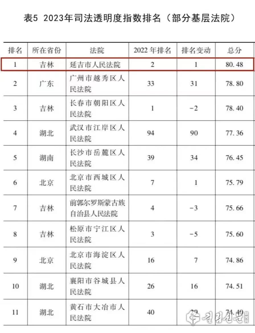 기자가 정리해본 데 따르면 2023년 사법 투명성 지수 순위(부분적인 기층법원) 앞자리 11위까지 연길시인민법원 외에도 장춘시조양구인민법원이 3위, 송원시 전고르로스몽골족자치현인민법원이 7위, 송원시 녕강구인민법원이 8위를 하는 등 길림성의 4개 기층법원이 선정되였다.