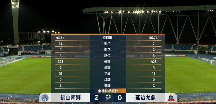 이날 무더운 날씨만큼이나 절주가 느렸던 두 팀의 전반 경기는 경기후 기술통계표가 내놓은 기록들을 보아도 답답했던 경기력을 읽을 수 있다. 그나마 2꼴을 폭발한 불산남사팀이 슈팅 13회에 유효슈팅 4회를 기록했다면, 연변팀은 슈팅 7회에 유효슈팅은 겨우 2회밖에 나오지 않았다. 지어 전반전에 연변팀은 유효슈팅이 아예 없기도 했다.