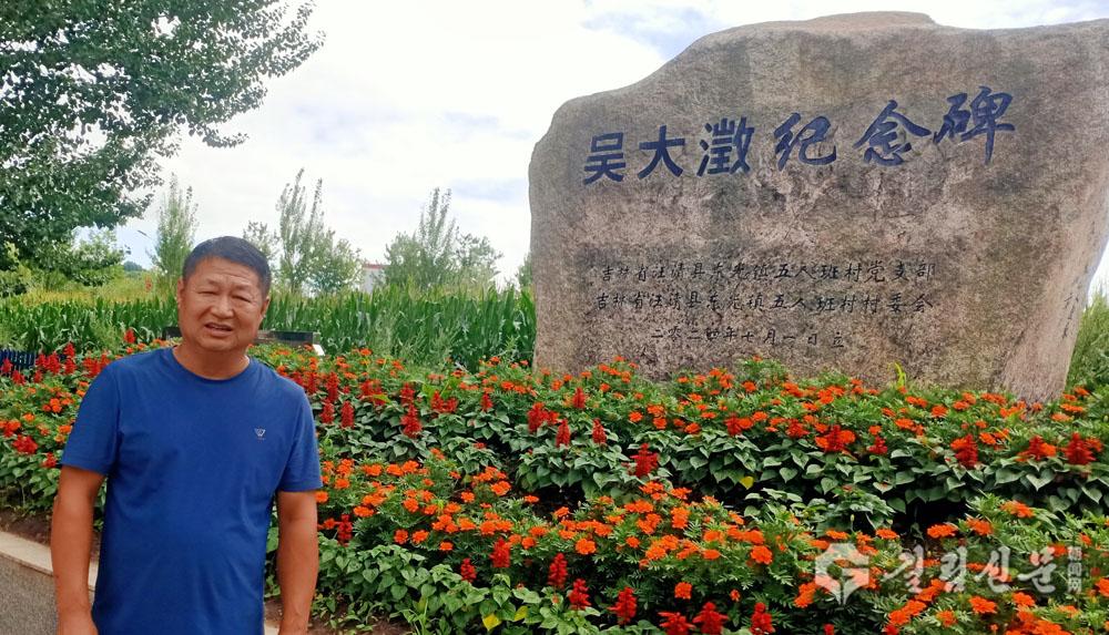 오대징기념비 설립과정을 소개하는 오인반촌 당지부서기, 촌민위원회 주임 관유씨.