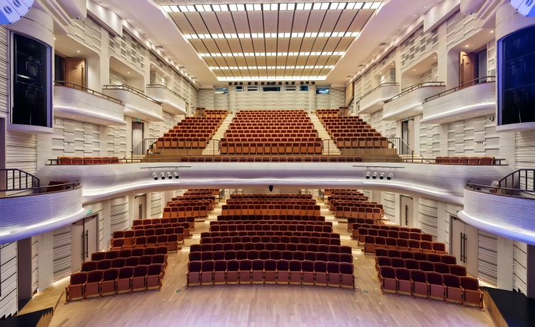 길림성음악당의 전체 스타일과 조화를 이루기 위해 관객석은 유럽식 디자인으로 제작되였다. 길림성음악당 좌석 제조사의 책임자인 고위는 좌석 구조가 고품질 너티나무(榉木)와 장부(榫卯) 공법을 사용하여 QB/T 2602-2013 표준을 완벽히 충족한다고 밝혔다. 등받이 쿠션에는 랭발포 폴리우레탄(冷发泡聚氨酯) 일체 성형 기술이 적용되여 부드러운 감촉과 기억 반등 기능이 구비되였으며 인체공학적 요구에 부합된다. 또한 혁신적으로 더블 토션 스프링 복원(双扭簧回位) 및 댐퍼 장치(阻尼装置)가 도입되여 1~3초 사이 무단계 조정이 가능한 무소음 복원이 실현되였으며 이는 사용 시 방해를 예방한다. 직물은 고급원단을 선택하고 정전기 방지 처리를 거쳐 마모성에 견디고 흡음성 등의 장점을 갖추었다. 음향 요구 사항을 충족하기 위해 38밀리메터 소리 확산 곡선형 등받이와 미세 구멍 투과성 막(微孔透声膜) 등의 전문 설계를 통해 빈석과 만원 상태의 평균 흡음 계수를 각각 약 0.67과 0.77로 제어하여 음장 최적화에 도달했다. 800여개의 좌석은 30일 이내에 신속히 설치되여 길림성음악당의 개조 프로젝트가 예정대로 진행될 수 있도록 보장했다.